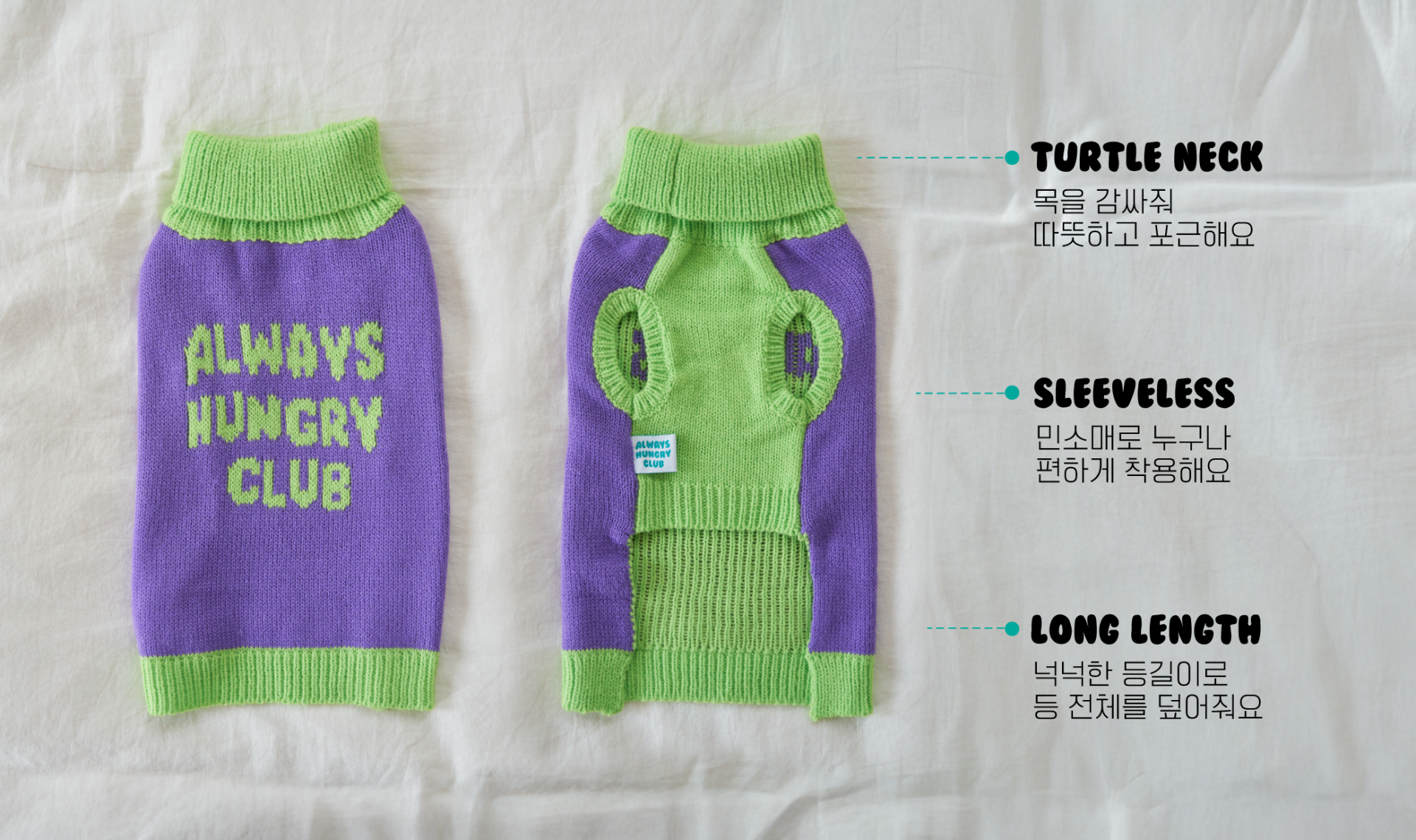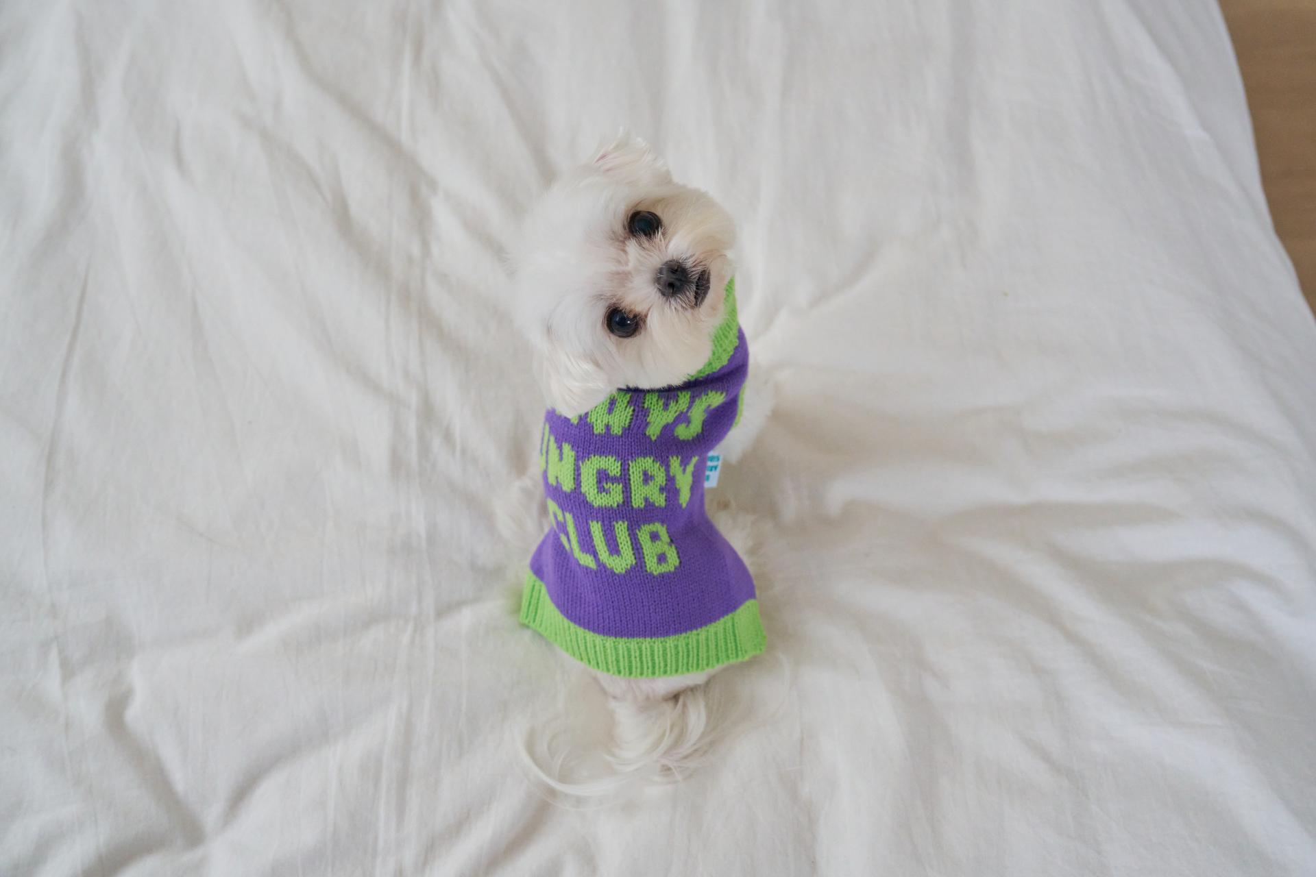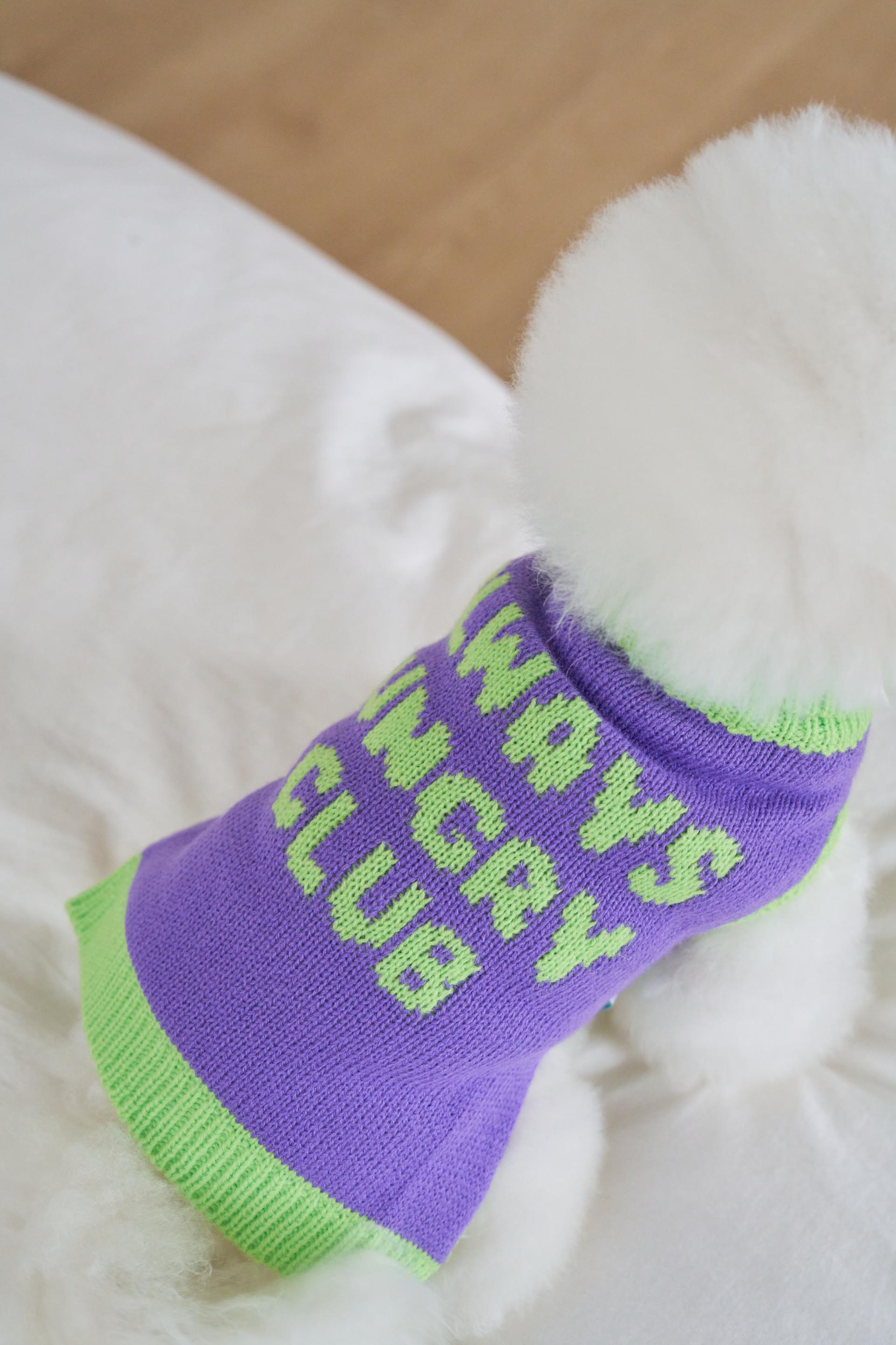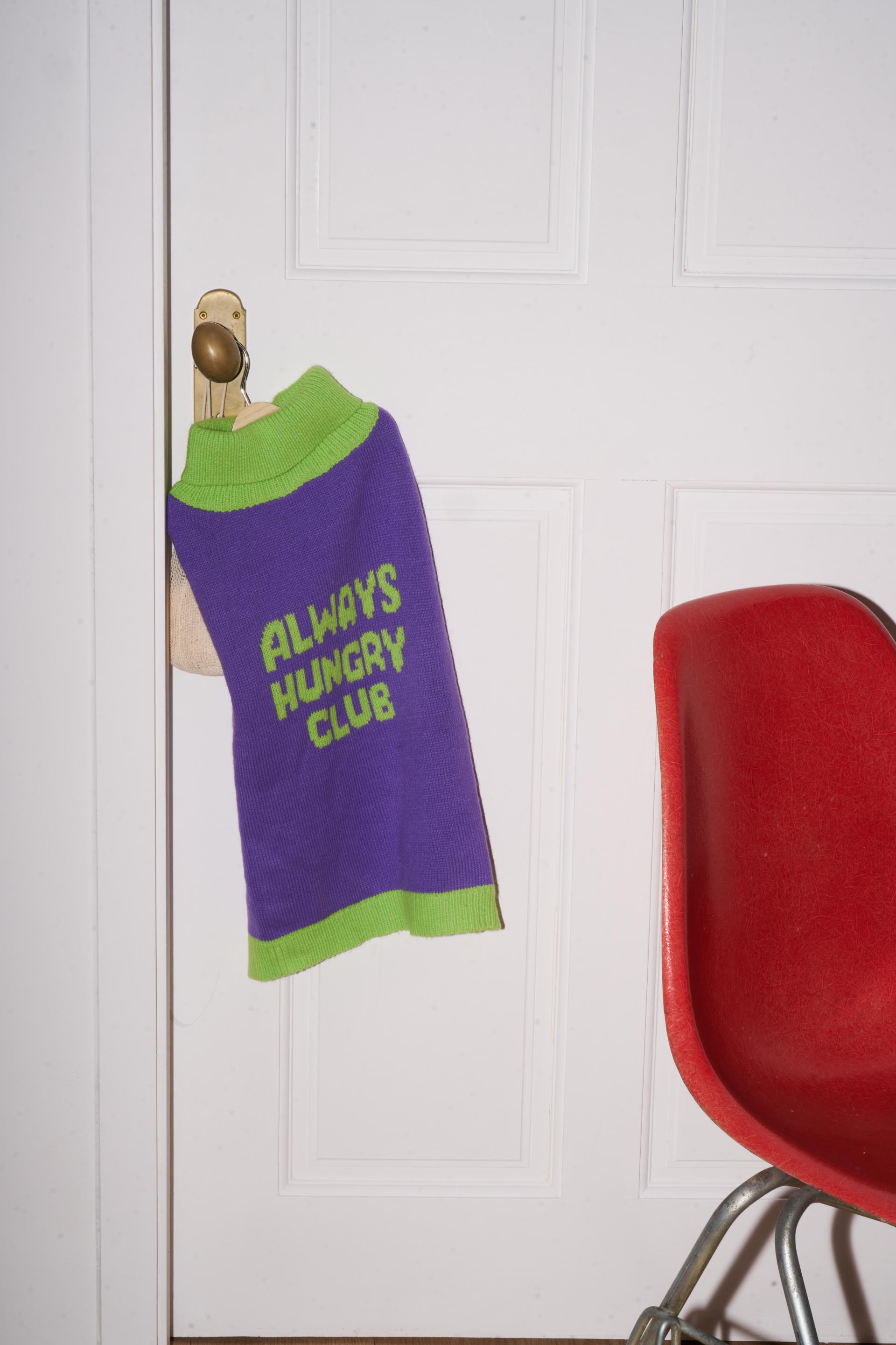Sleeveless sweater with Always Hungry Club logo graphic.